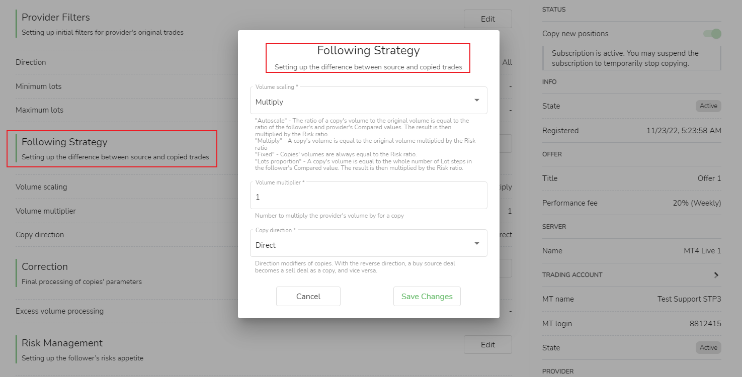 • The due position of the copy account is equal to the signal source account's transaction volume multiplied by the transaction volume multiplier
