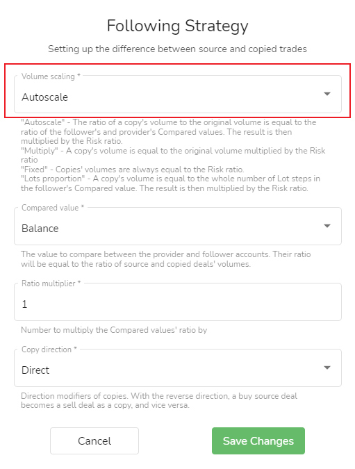 Comparison value:The ratio between the trading volume of the signal source and the trading volume of the follower's account. You can choose [Balance] or [Equity]