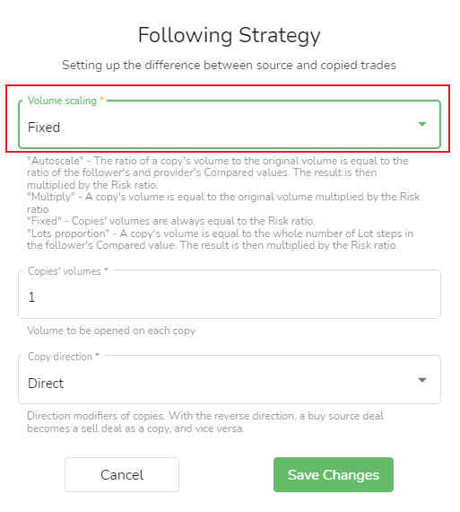 • The correction sets the maximum amount of copied trades that will eventually be executed. CopyTrading's follower can not only control the risk of the trading position of the signal source, but also control the risk of the size of the position they should place.