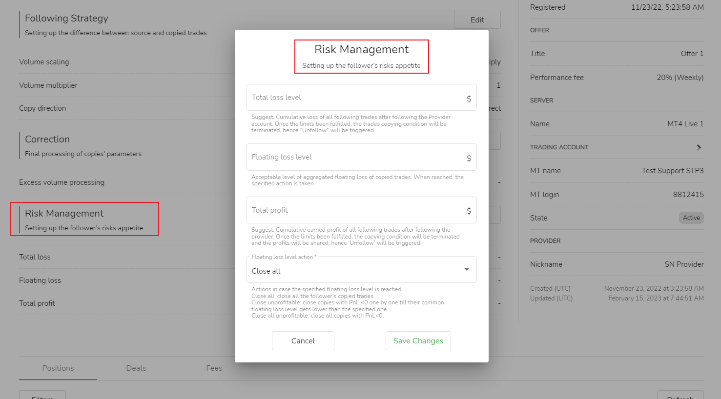 Followers can set take-profit and stop-loss levels in risk management to manage the risk of their own accounts.