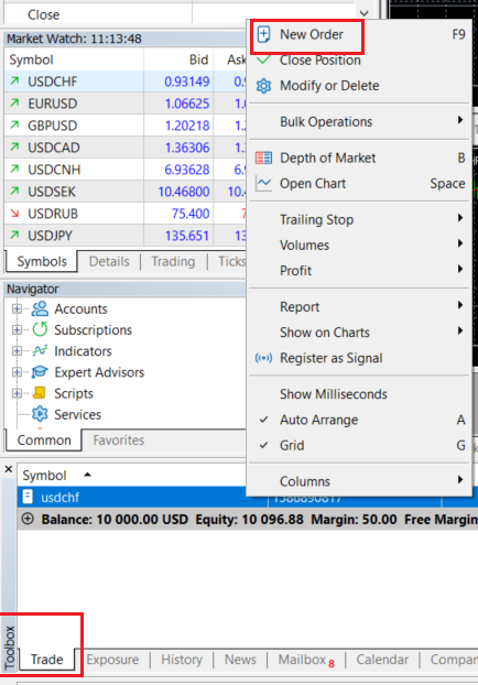 3. In the [Trade] list of the toolbox, right-click to select a product that holds a position, and then click [New Order].