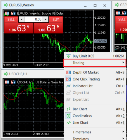 5. Create a new order in the chart window, right-click on the blank space in the chart, and click [Trade] to create a new order.