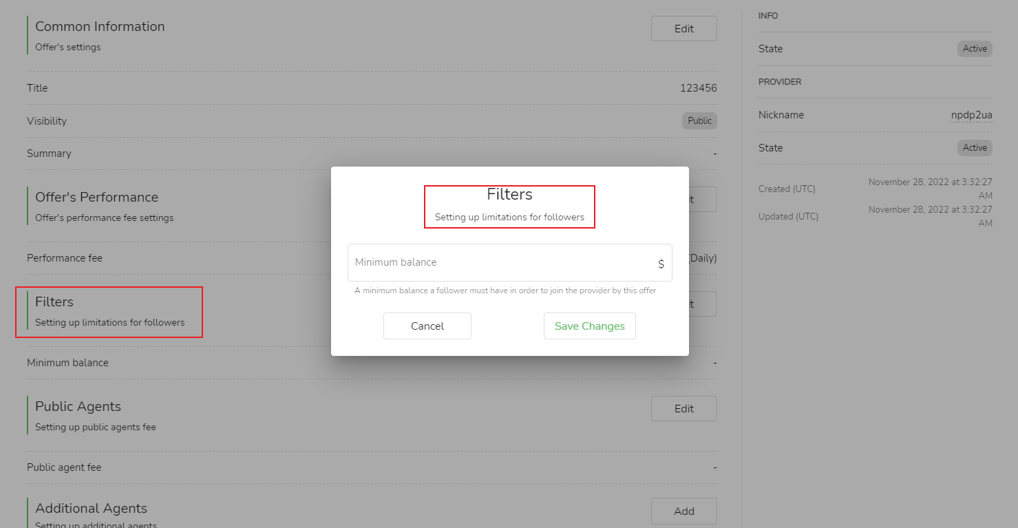 Después de que las condiciones de copia de la fuente de señal se hayan creado correctamente, puede hacer clic en la flecha para ingresar a la página de edición y editar [Apodo], [Tarifa de rendimiento de fuente de señal], [Condiciones de filtro], [Introducción y promoción], [Socios de fuente de señal] y el enlace [Adición de fuente de señal]] para obtener más configuraciones.