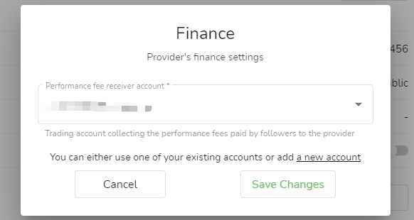 2. En la ventana emergente, seleccione la cuenta en la que desea recibir la tarifa de rendimiento y haga clic en "Guardar cambios".