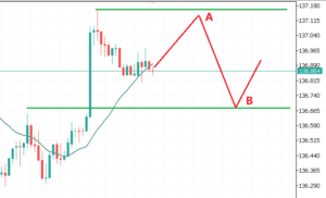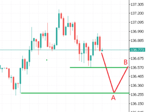 c) Quando o preço do USDJPY toca a linha A para baixo, ative a ordem Sell Limit na linha B, e quando o preço rebate da linha A para a linha B, uma ordem Sell é executada ao preço da linha B;