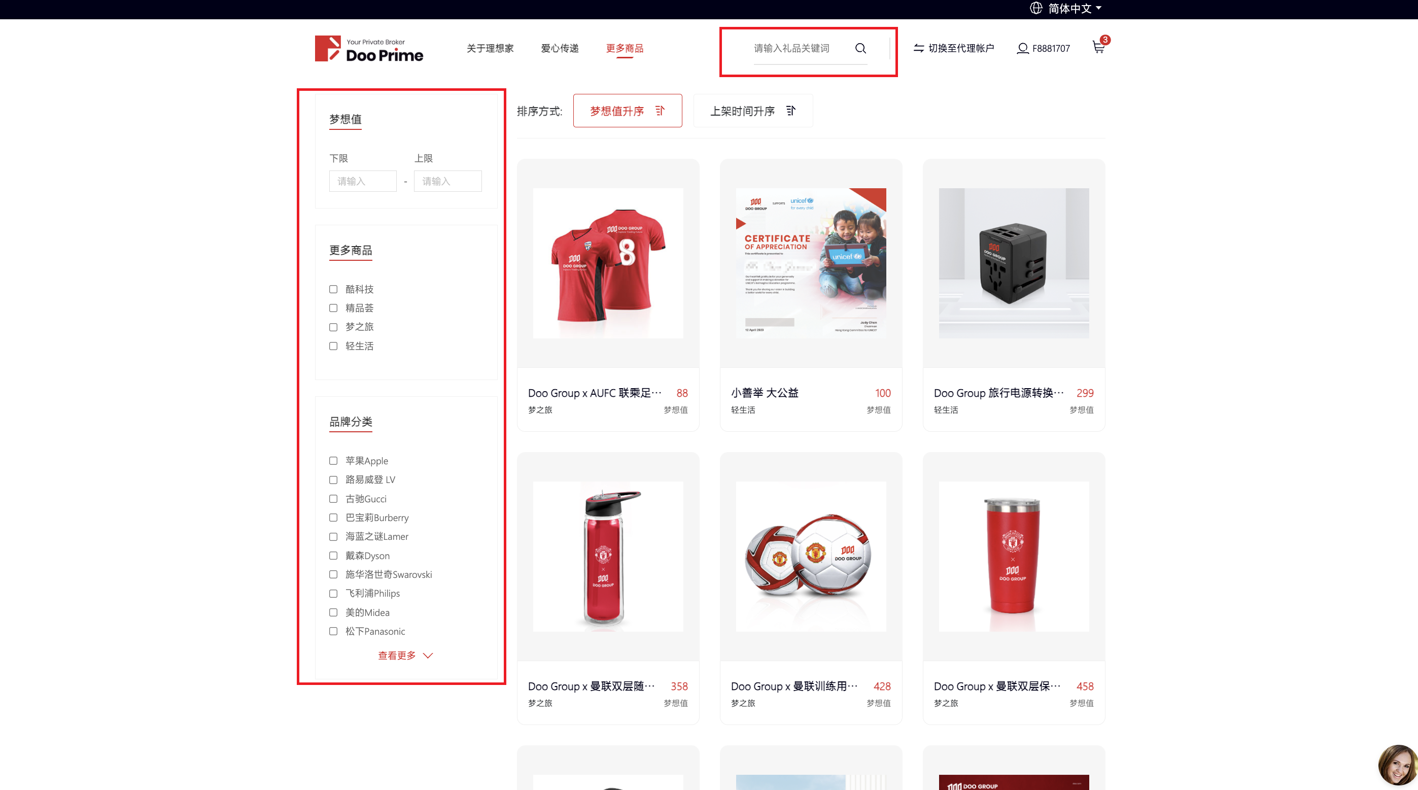 - 登录 Doo Prime「理想家」积分商城,按照名称/梦想值价值/品类/品牌搜索你想要的礼品
