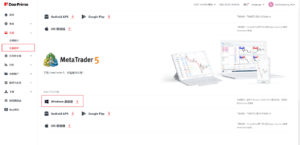 完成登录后,可在左侧菜单的【交易】下选择【交易软件】,然后在 【MetaTrader 5】的图标下选择对应端口。