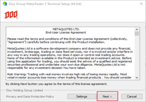 MT5 Windows 桌面版下载完成后,根据安装指引点击图中的【Next】,便可开启安装。