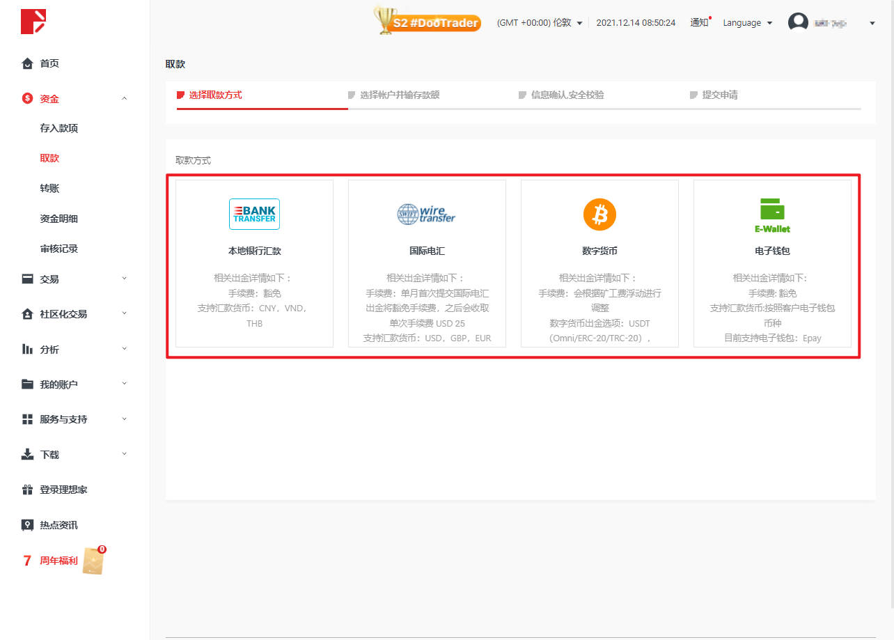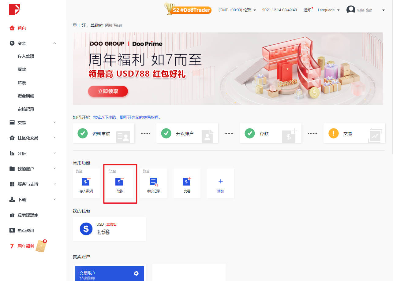 登錄進入Doo Prime 用戶中心首頁後,在「常用功能」一欄點擊「取款」。