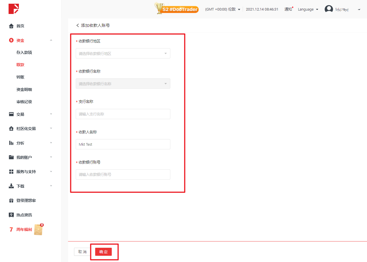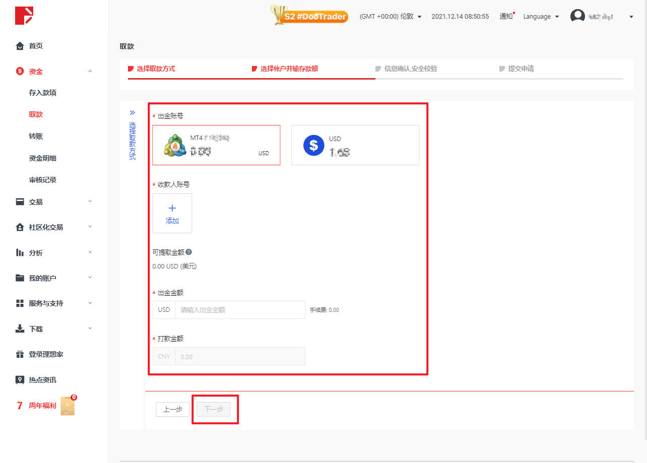 選擇取款賬號和收款人賬號,填寫取款金額(美金),完成後點擊「下一步」。