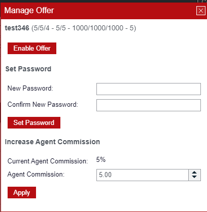 d. Để thay đổi "Hoa hồng đại lý" hoặc/và "Mật khẩu", hãy nhấp vào "Quản lý" trong bảng "Báo giá và người theo dõi". Chọn "Tắt" hoặc "Bật báo giá" để thay đổi trạng thái của báo giá.