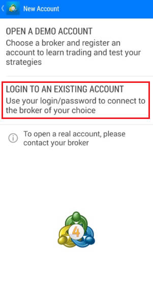 Sau khi cài đặt phiên bản di động MetaTrader 4, bấm mở phần mềm để vào trang đăng nhập, nếu bạn đã mở tài khoản thật, vui lòng chọn "Đăng nhập vào tài khoản hiện có".