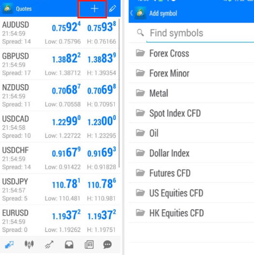 Nhấp vào biểu tượng ở góc trên bên phải và chọn thêm nhiều loại giao dịch; nền tảng Doo Prime bao gồm các cặp tiền tệ, kim loại quý, dầu thô, v.v., bạn có thể tự thêm vào.